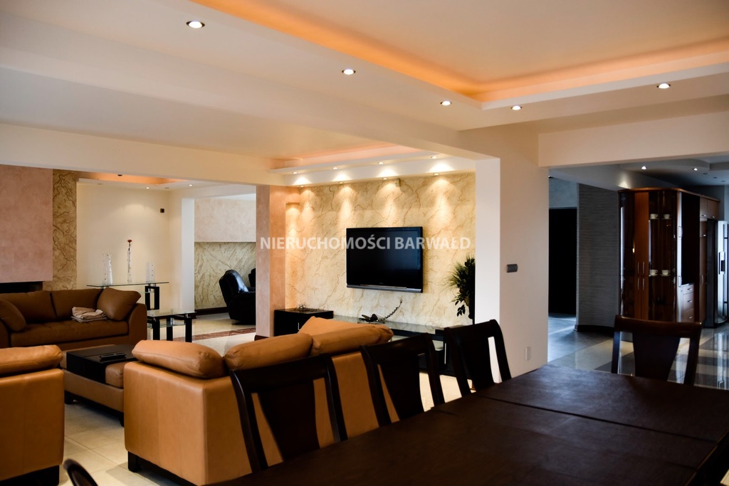 - salon, kuchnia, główna sypialnia z łazienką i garderobą, gabinet, strefa wypoczynkowa, piękne schody drewniane